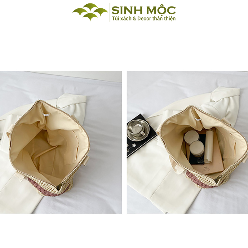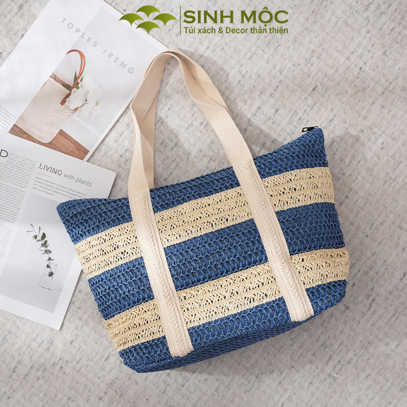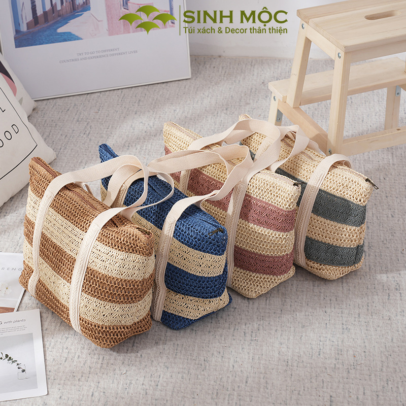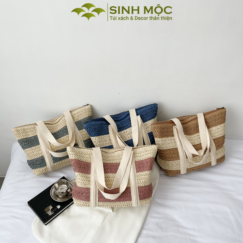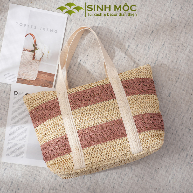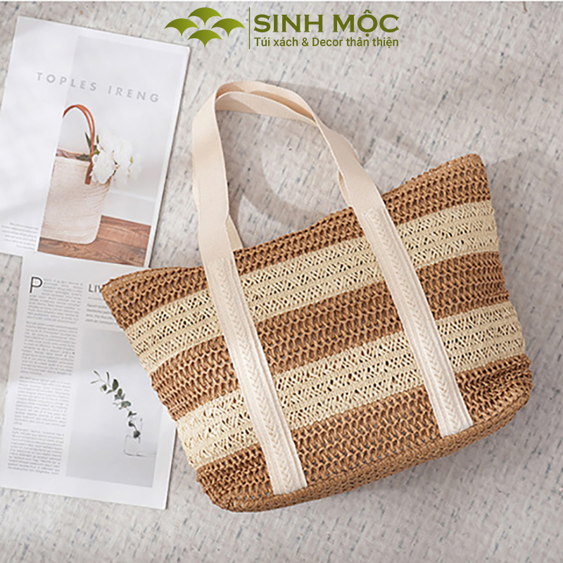 Túi đi biển, túi xách nữ giả cói, túi kẻ ngang Sinh Mộc - M3832