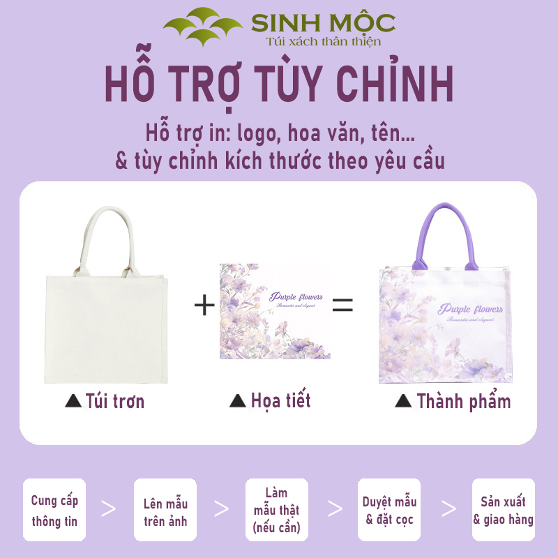 Sinh Mộc cung cấp dịch vụ in logo, tên cá nhân hoặc thiết kế tùy chỉnh với chất lượng in sắc nét và chuyên nghiệp. Phù hợp làm túi đựng sản phẩm thương hiệu, túi sự kiện hoặc bao bì quà tặng đồng bộ.